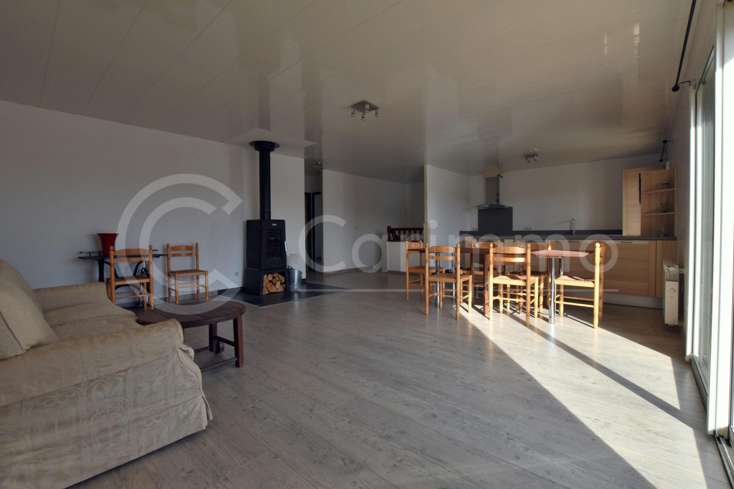 A l’étage, beau Salon / Séjour avec poêle à bois et Cuisine équipée ouverte, l’ensemble pour 57m², avec accès à grand balcon / terrasse; Espace nuit comprenant 2 chambres de 15m² et 11,5m², Salle de bains et WC séparés.