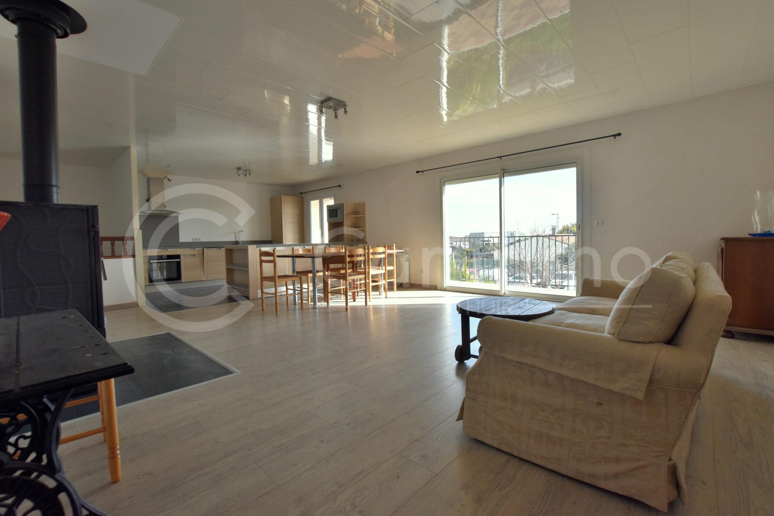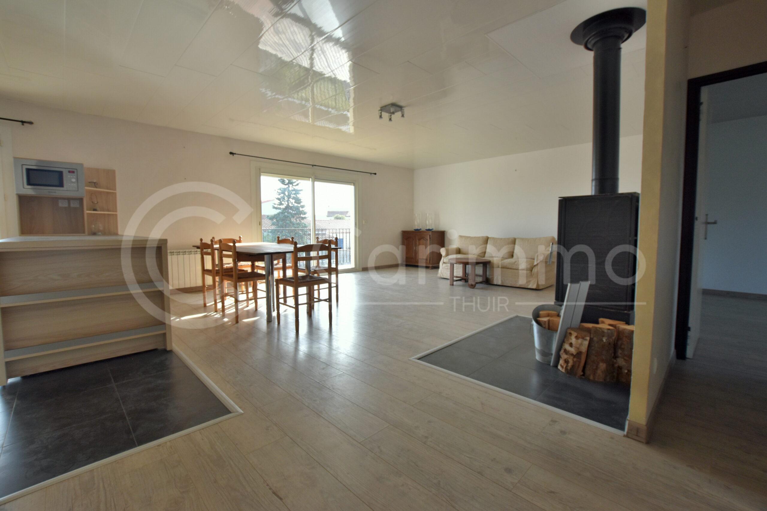 A l’étage, beau Salon / Séjour avec poêle à bois et Cuisine équipée ouverte, l’ensemble pour 57m², avec accès à grand balcon / terrasse; Espace nuit comprenant 2 chambres de 15m² et 11,5m², Salle de bains et WC séparés.