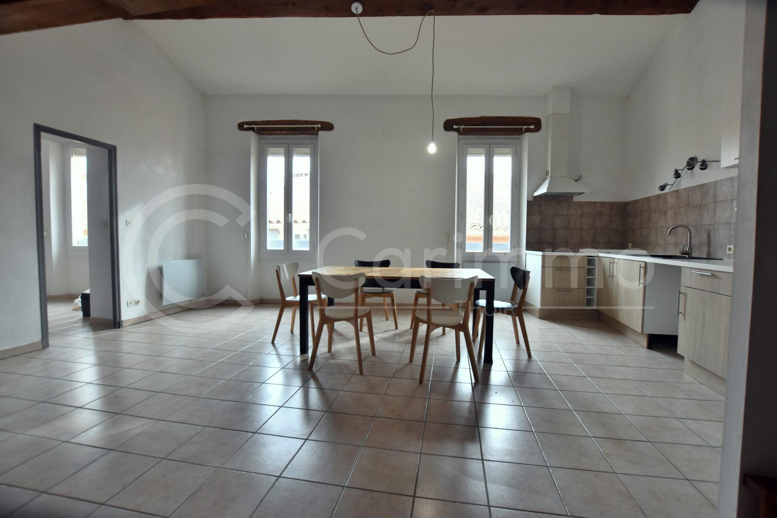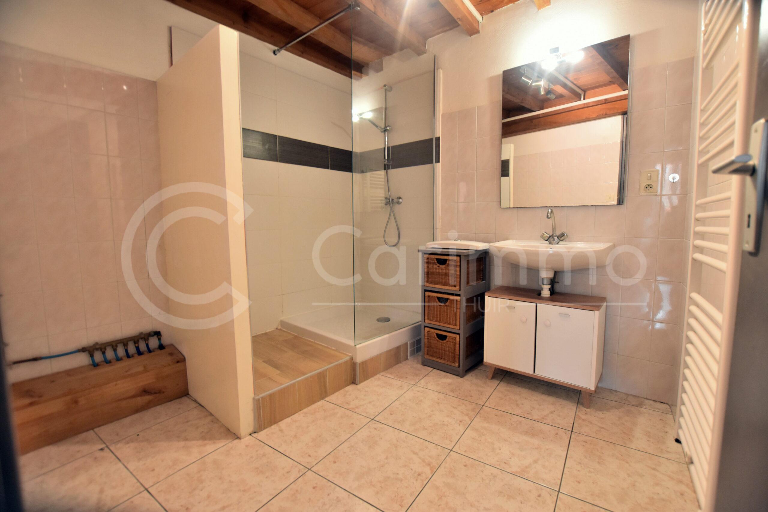 Un appartement T3 de 92m² comprenant un séjour de 28m², Cuisine de 20m² environ, 2 chambres (17m² et 14m²), salle d’eau avec WC, et une pièce débarras en rez-de-chaussée de près de 12m².
